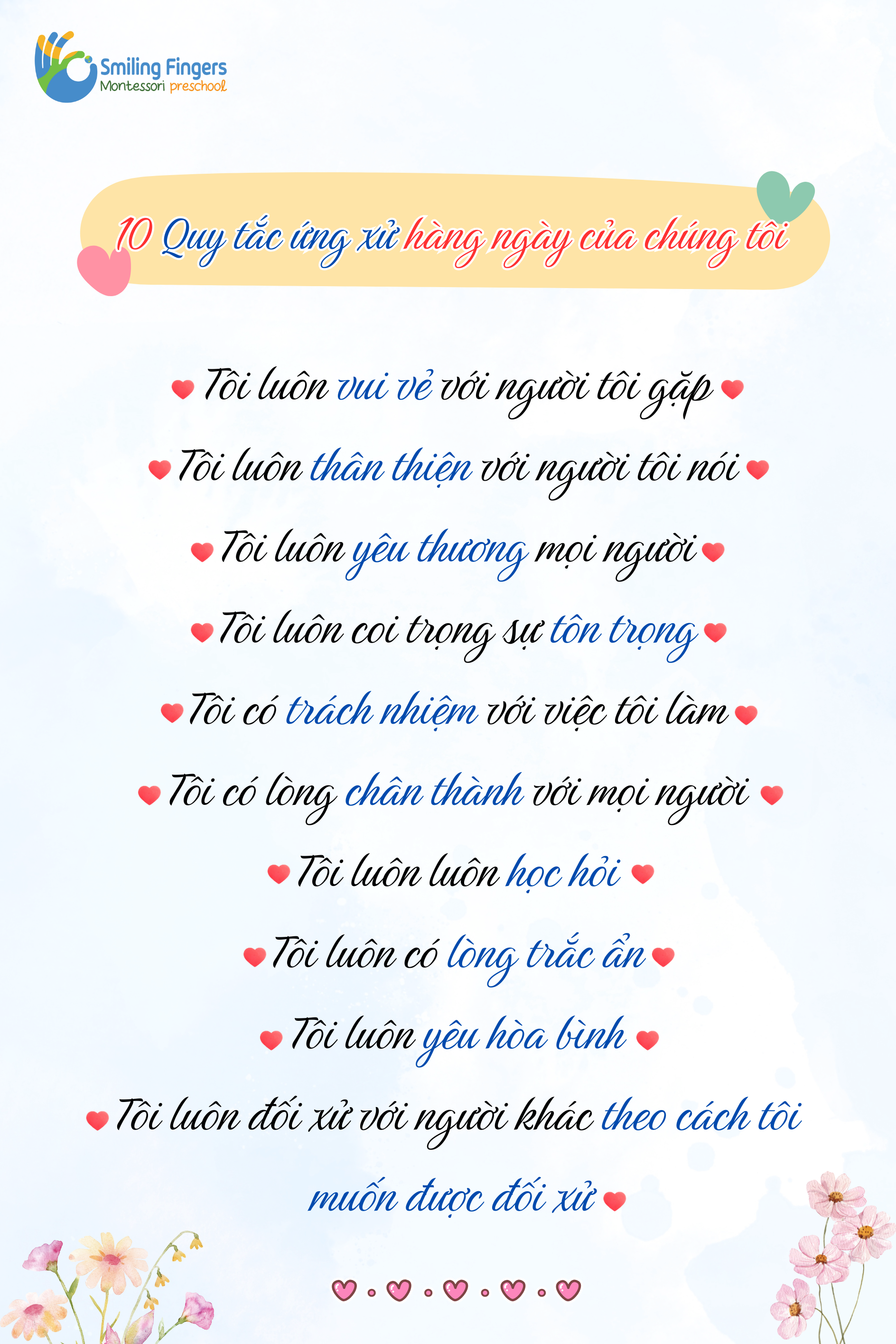 Đội ngũ giáo viên của Trường mầm non song ngữ Smiling Fingers luôn trân trọng những giá trị về đạo đức nghề nghiệp, am hiểu tâm lý trẻ thơ trong vai trò là người hướng dẫn, hỗ trợ và luôn đồng hành với trẻ. Luôn lắng nghe, chia sẻ và phối hợp chặt chẽ với phụ huynh trong việc chăm sóc trẻ. Thường xuyên cập nhật kiến thức thông qua các chương trình đào tạo dài hạn, ngắn hạn, hội nghị, hội thảo do các Hiệp hội Montessori quốc tế AMI, IMC tổ chức.